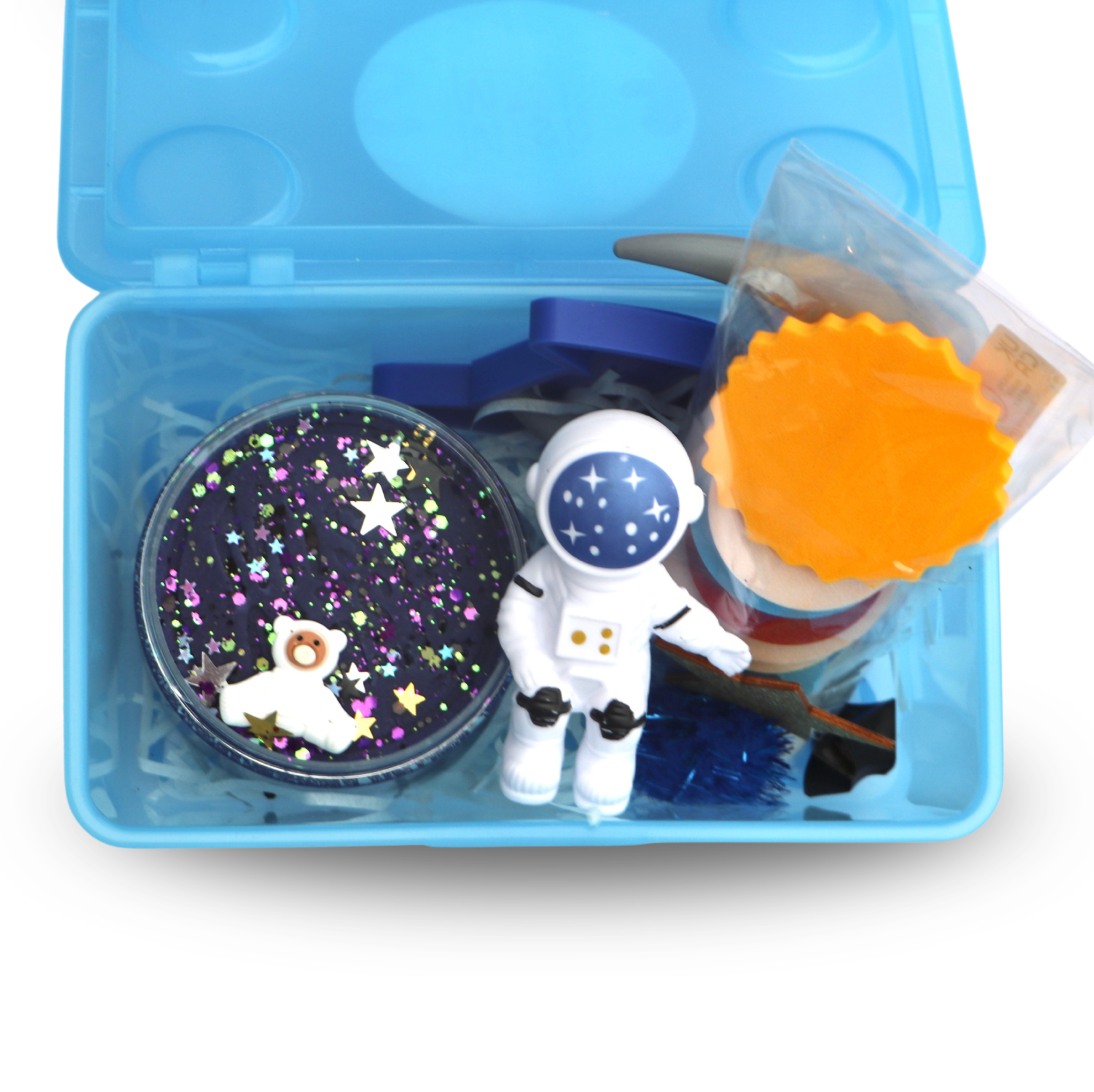 Filled with deep blue playdough, shimmering stars, mini astronauts, eco-friendly planet tokens and a rocket cutter. This kit invites little explorers to build rockets, orbit planets, and create their very own galaxy scenes. A hands-on, screen-free activity that turns playtime into an exciting space adventure, perfect for curious minds who love all things outer space.